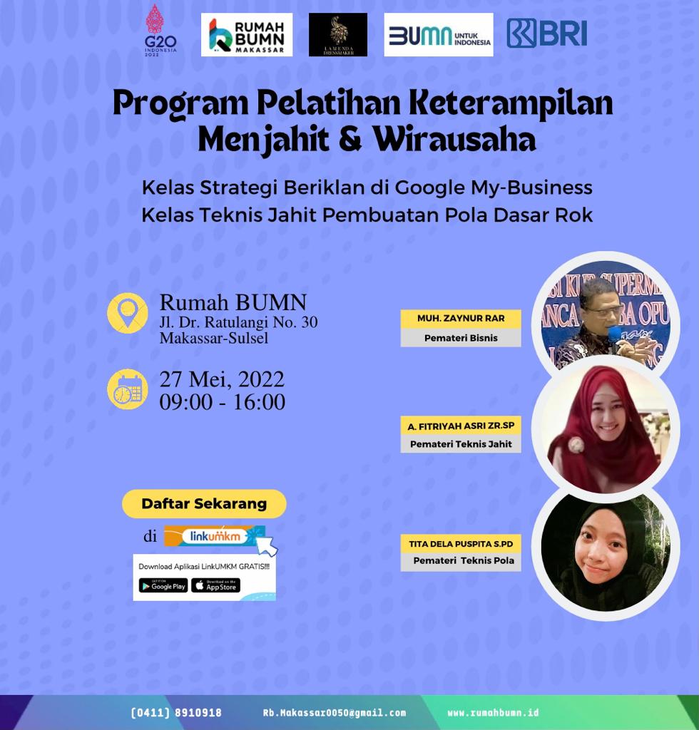 Rumah BUMN Makassar Berkolaborasi dengan Komunitas Jarum Benang akan melangsungkan kegiatan Pelatihan Klaster Fashion “Kelas Teknis Jahit Pembuatan Pola Dasar Rok”. Diharapkan output pelatihan ini akan meningkatkan skill/keterampilan agar dapat membantu meningkatkan kesejahteraan rumah tangga.