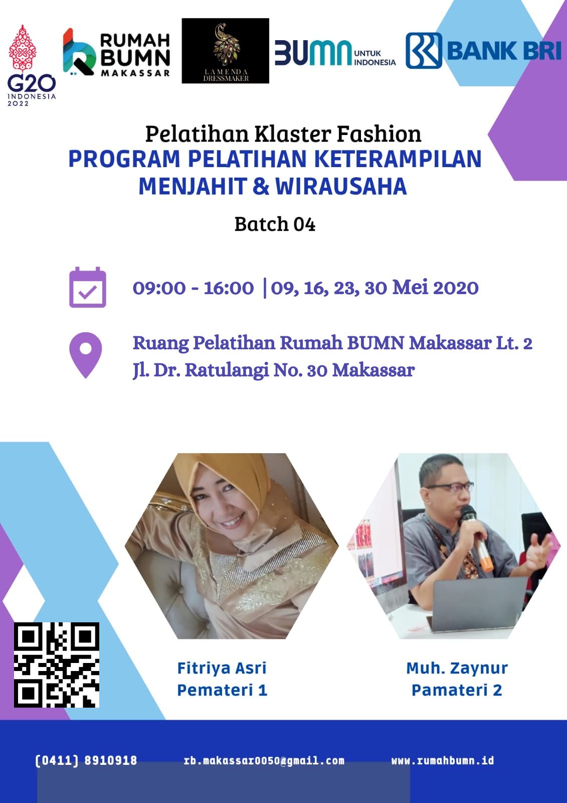 Rumah BUMN Makassar Berkolaborasi dengan Komunitas Jarum Benang akan melangsungkan kegiatan Pelatihan Klaster Fashion “Program Pelatihan Keterampilan Jahit Menjahit & Wirausaha Lanjutan Batch 04”. Diharapkan output pelatihan ini akan meningkatkan skill/keterampilan agar dapat membantu meningkatkan kesejahteraan rumah tangga.