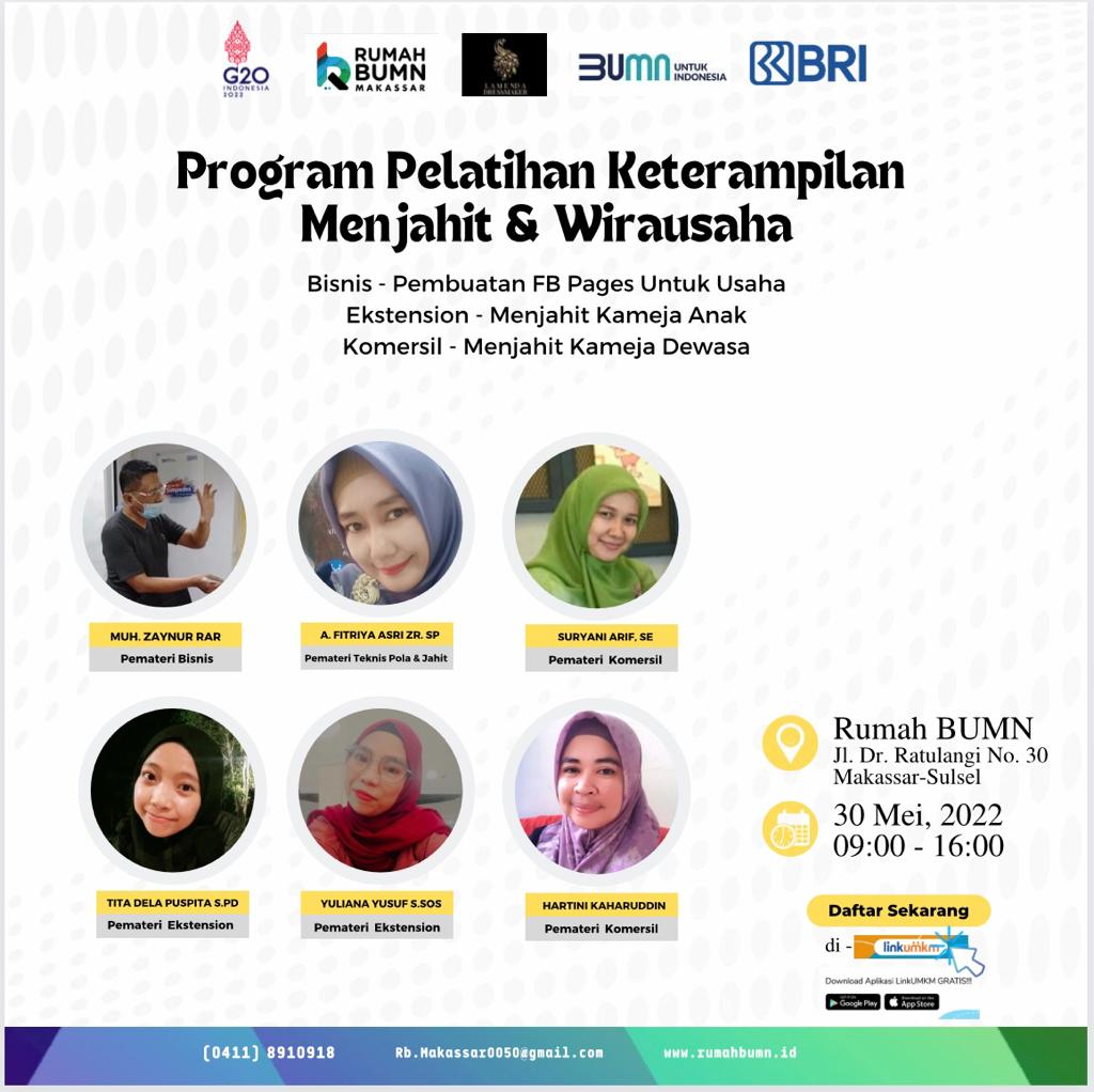 Rumah BUMN Makassar Berkolaborasi dengan Komunitas Jarum Benang akan melangsungkan kegiatan Pelatihan Klaster Fashion “Kelas Komersil Materi Menjahit Kameja Dewasa”. Diharapkan output pelatihan ini akan meningkatkan skill/keterampilan agar dapat membantu meningkatkan kesejahteraan rumah tangga.