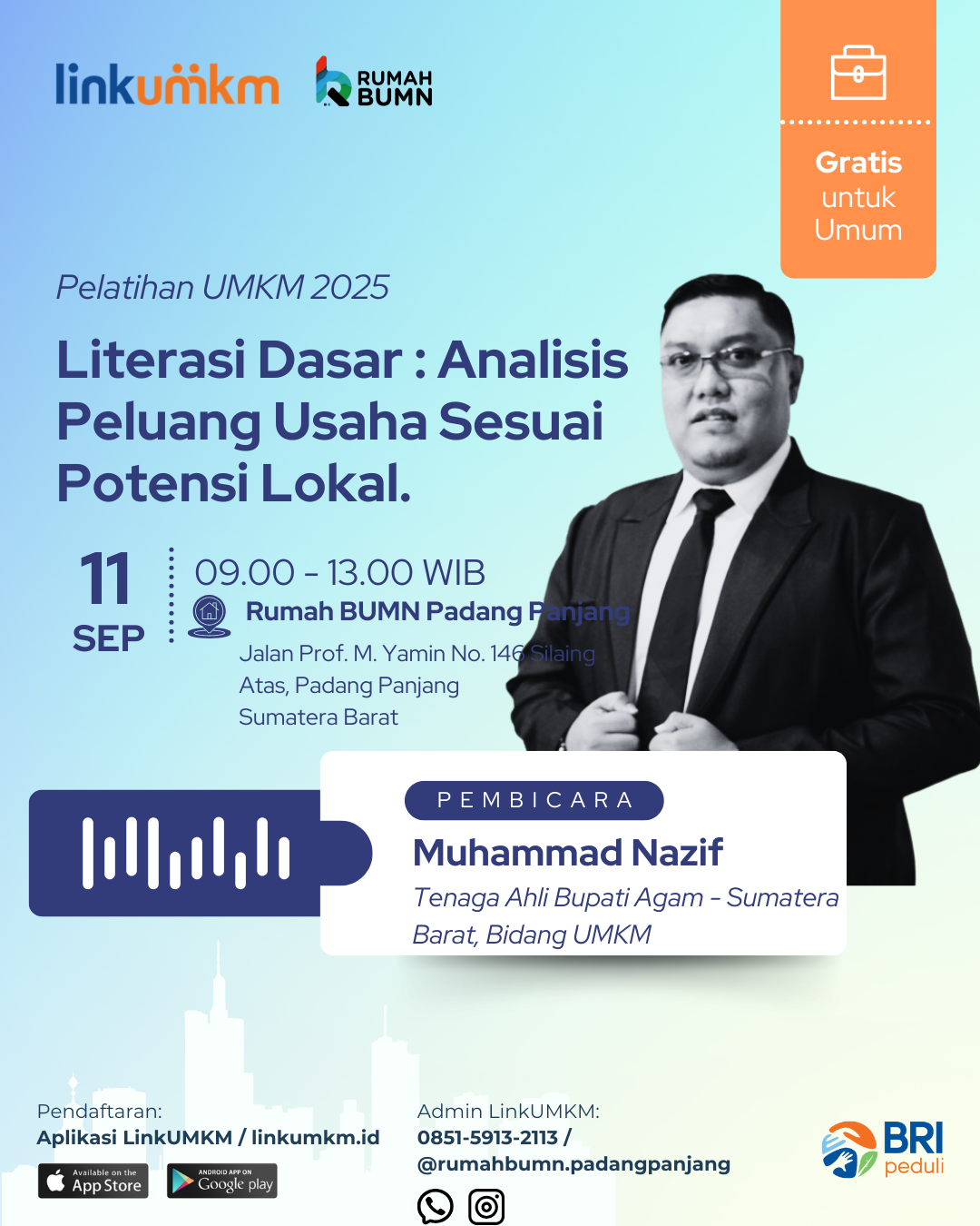 Rumah BUMN Padang Panjang mengadakan Pelatihan Literasi Dasar Analisis Peluang Usaha Sesuai Potensi Lokal. Menghadirkan pakar dibidangnya demi kemajuan UMKM Indonesia.