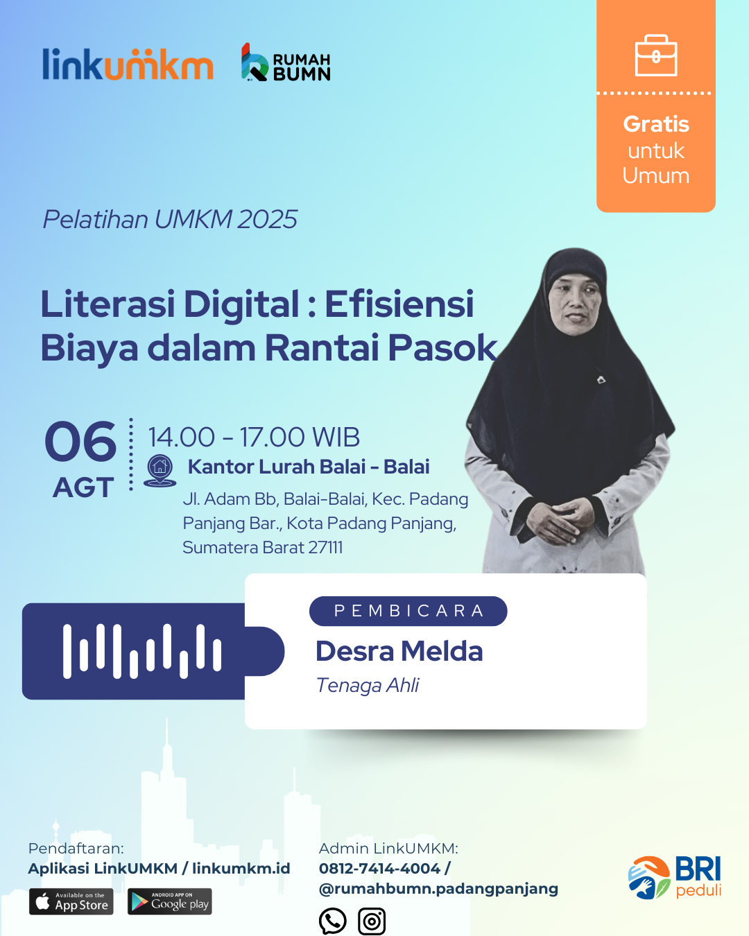 Rumah BUMN Padang Panjang mengadakan PLiterasi Digital Efisiensi Biaya dalam Rantai Pasok. Menghadirkan pakar dibidangnya demi kemajuan UMKM Indonesia.