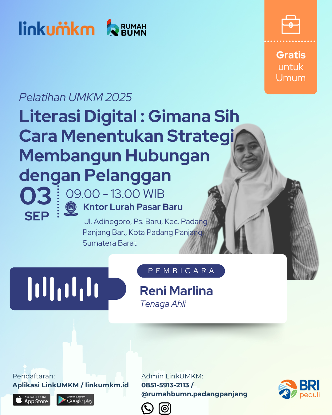 Rumah BUMN Padang Panjang mengadakan Literasi Digital Gimana Sih Cara Menentukan Strategi Membangun Hubungan dengan Pelanggan. Menghadirkan pakar dibidangnya demi kemajuan UMKM Indonesia.