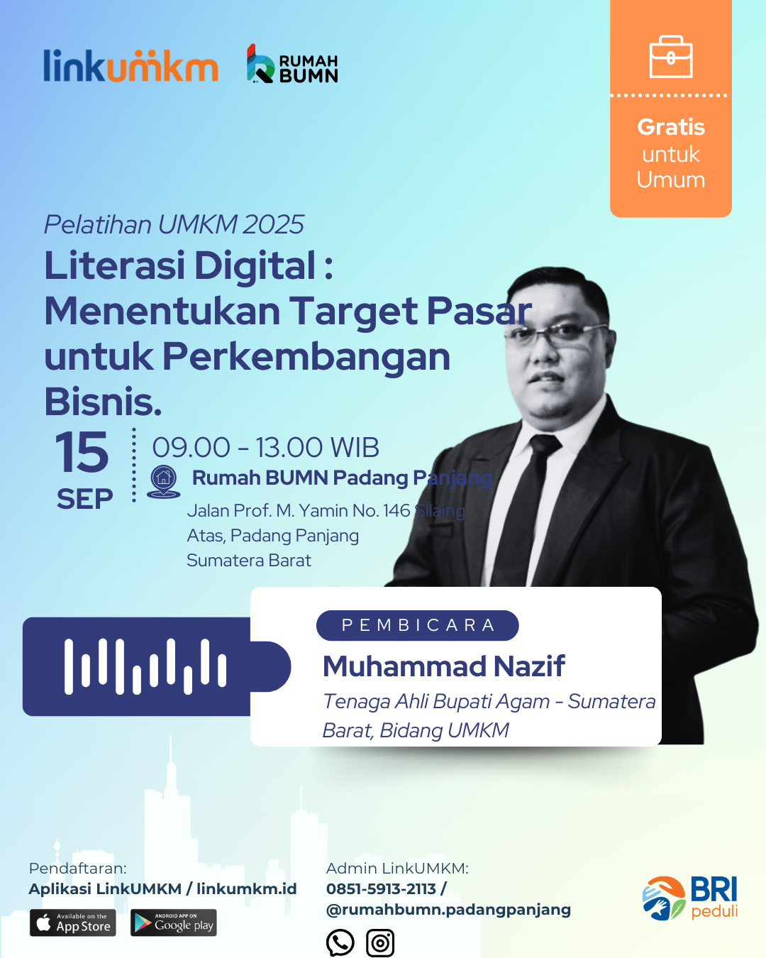 Rumah BUMN Padang Panjang mengadakan Pelatihan Literasi Digital Menentukan Target Pasar untuk Perkembangan Bisnis. Menghadirkan pakar dibidangnya demi kemajuan UMKM Indonesia.