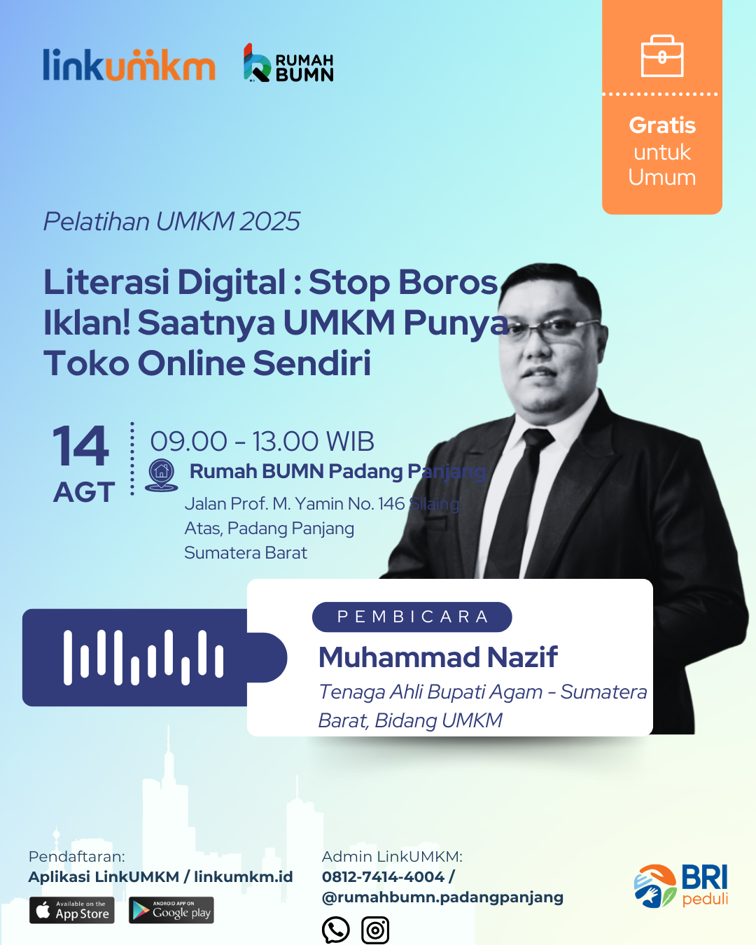 Rumah BUMN Padang Panjang mengadakan Pelatihan Literasi Digital Stop Boros Iklan Saatnya UMKM Punya Toko Online Sendiri . Menghadirkan pakar dibidangnya demi kemajuan UMKM Indonesia.