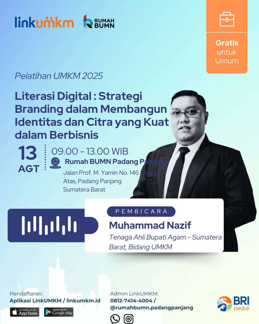 Rumah BUMN Padang Panjang mengadakan Pelatihan Literasi Digital Strategi Branding dalam Membangun Identitas dan Citra yang Kuat dalam Berbisnis. Menghadirkan pakar dibidangnya demi kemajuan UMKM Indonesia.