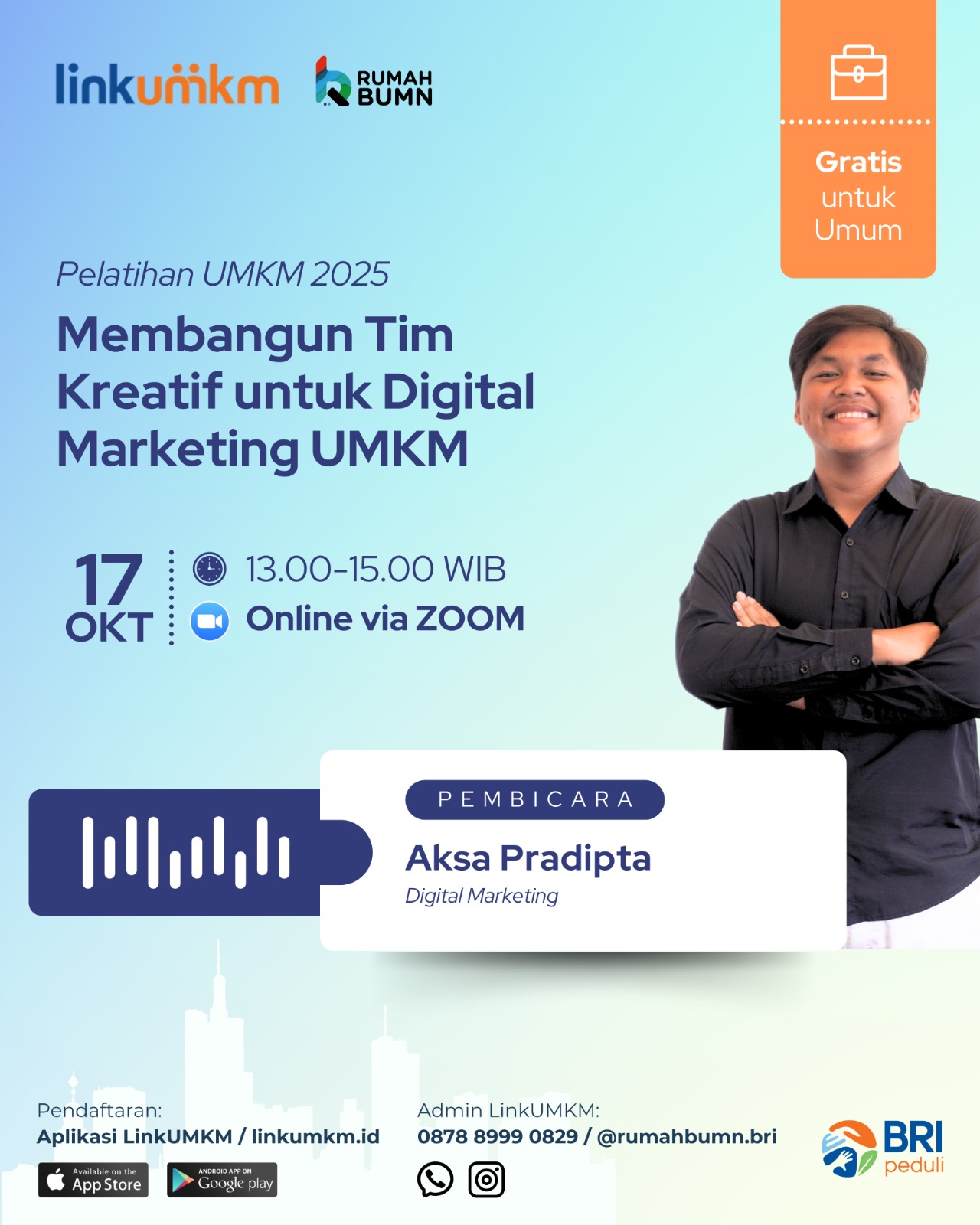 Lewat pelatihan "Membangun Tim Kreatif untuk Digital Marketing UMKM", kami bantu kamu bentuk tim yang bisa kerja bareng, bikin konten kece, dan bawa brand kamu makin dikenal!