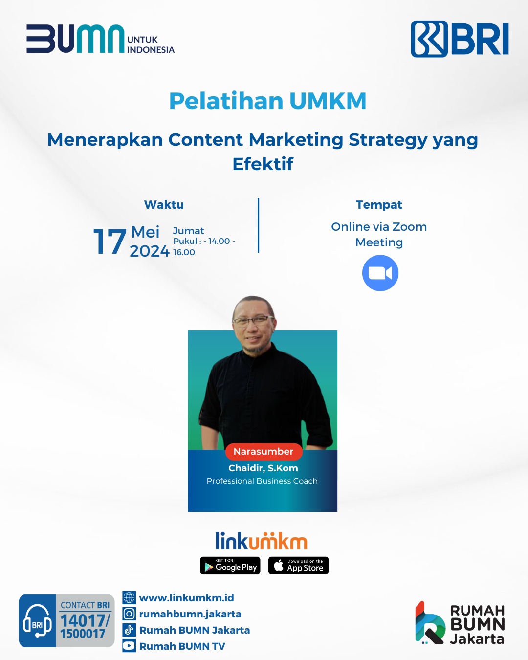 Pelatihan ini diadakan secara online pada tanggal 17 mei 2024 oleh pak Chaidir mengenai "Menerapkan Content Marketing Strategy yang Efektif". Pelatihan ini akan dimulai pada pukul 14.00-16.00