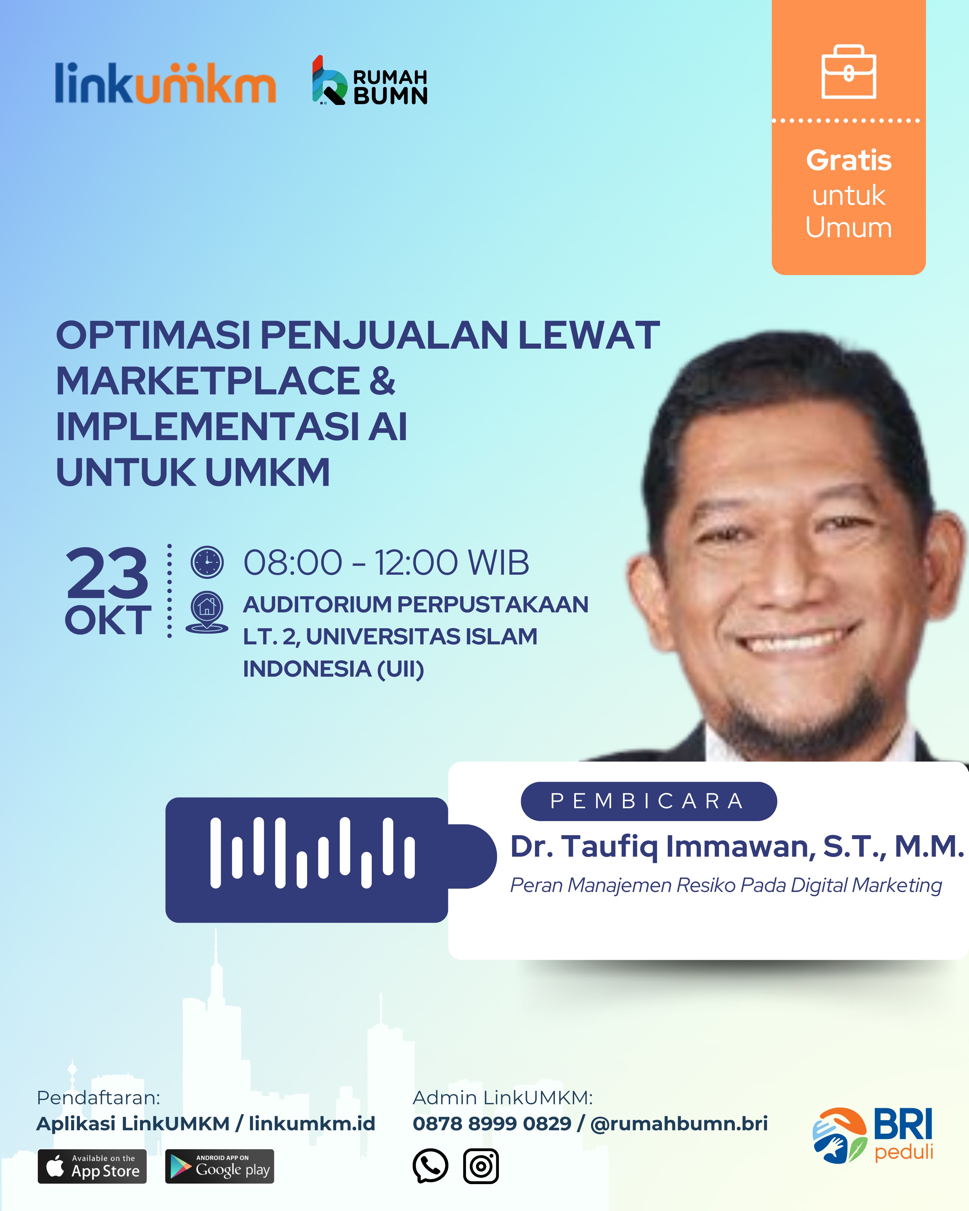 Platform Linkumkm (selanjutnya disebut “Platform”) adalah suatu situs jejaring sosial yang digunakan secara online atau menggunakan akses internet yang dibuat dengan tujuan agar membawa UMKM Indonesia naik kelas melalui rangkaian program pemberdayaan terpadu. LinkUMKM merupakan platform yang diselenggarakan oleh BRI Research Institute (BRIRINS) yang bekerjasama dengan PT Bank Rakyat Indonesia (Persero) Tbk. (selanjutnya disebut “Kami”) untuk mendukung pengembangan UMKM.