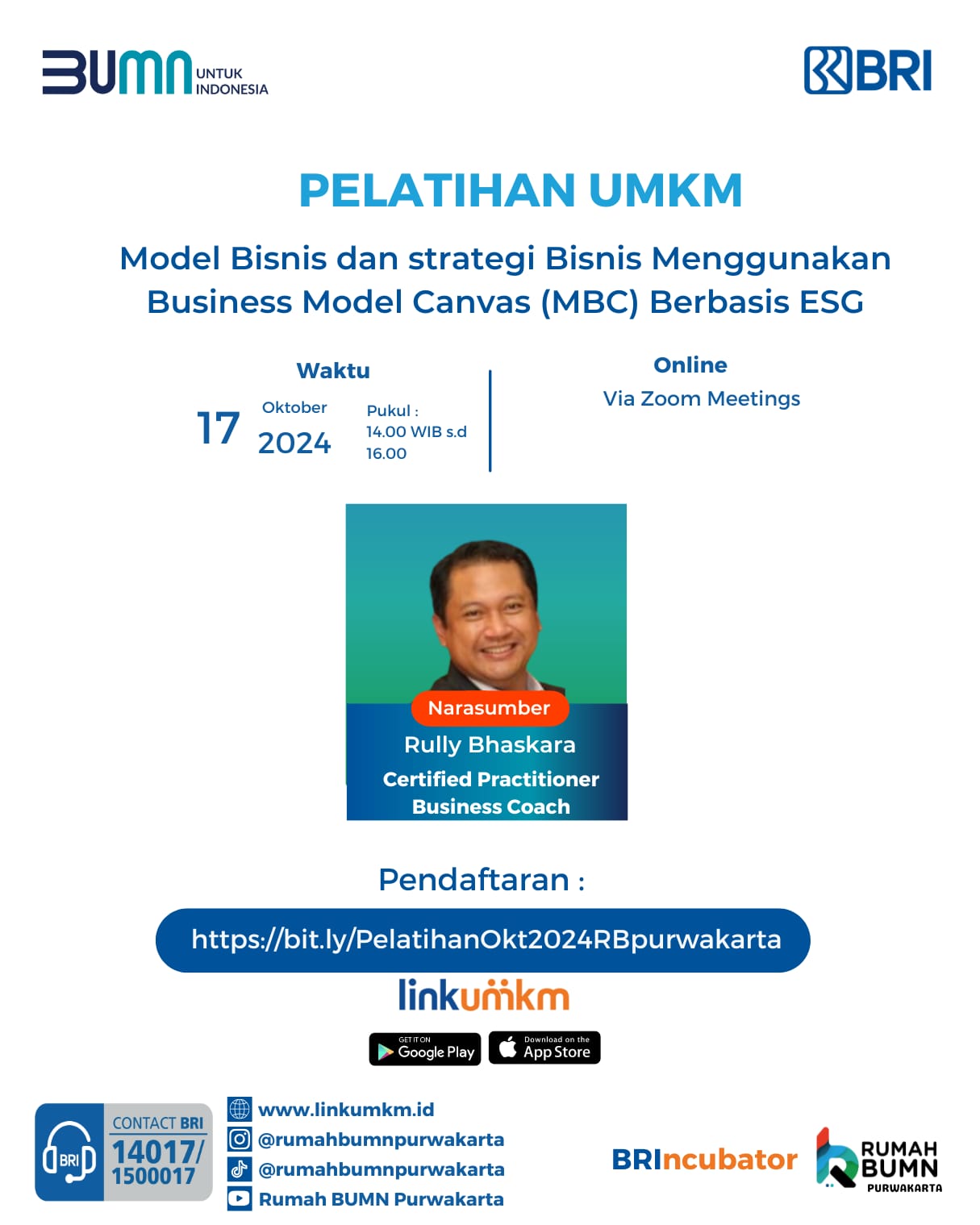 Nama Narasumber : Rully Bhaskara Judul pelatihan :MODEL BISNIS DAN STRATEGI BISNIS MENGGUNAKAN BUSINESS MODEL CANVAS BERBASIS ESG jadwal : 17 OKTOBER 2024 waktu : 14.00 - 16.00 Tempat : Rumah BUMN Purwakarta Online
