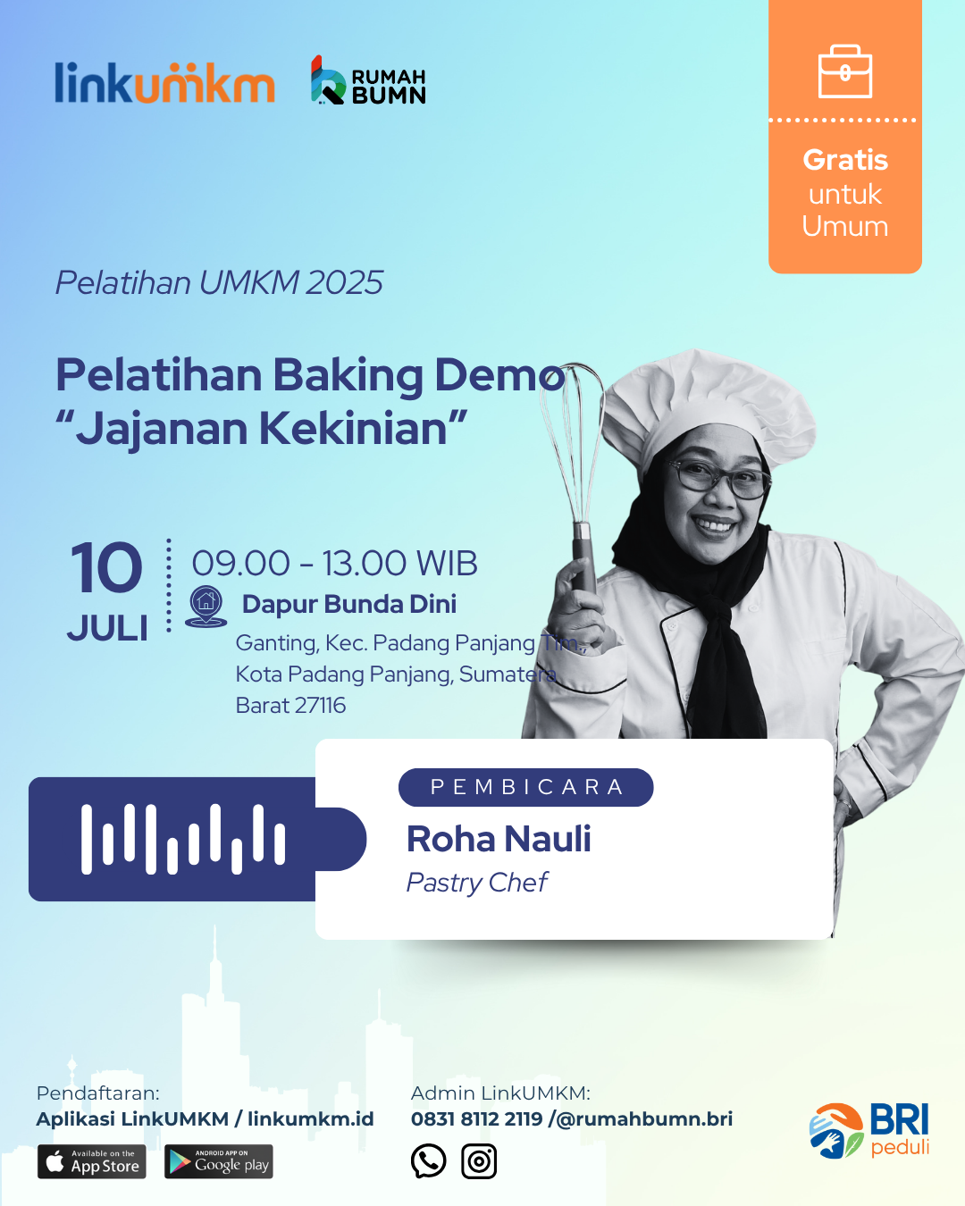 Rumah BUMN Padang Panjang mengadakan Pelatihan Baking Demo Jajanan Kekinian. Menghadirkan pakar dibidangnya demi kemajuan UMKM Indonesia.