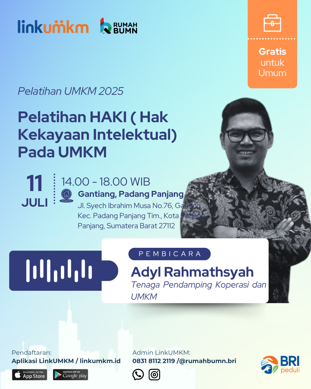 Rumah BUMN Padang Panjang mengadakan Pelatihan HAKI Hak Kekayaan Intelektual Pada UMKM. Menghadirkan pakar dibidangnya demi kemajuan UMKM Indonesia.