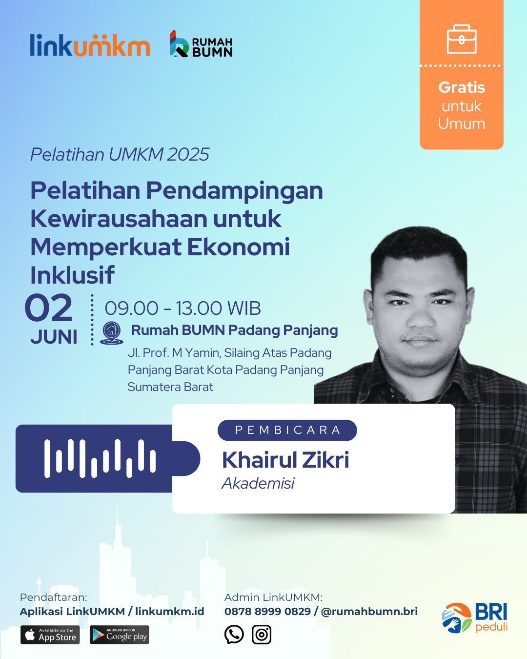 Rumah BUMN Padang Panjang mengadakan Pelatihan Pendampingan Kewirausahaan untuk Memperkuat Ekonomi Inklusif. Menghadirkan pakar dibidangnya demi kemajuan UMKM Indonesia.