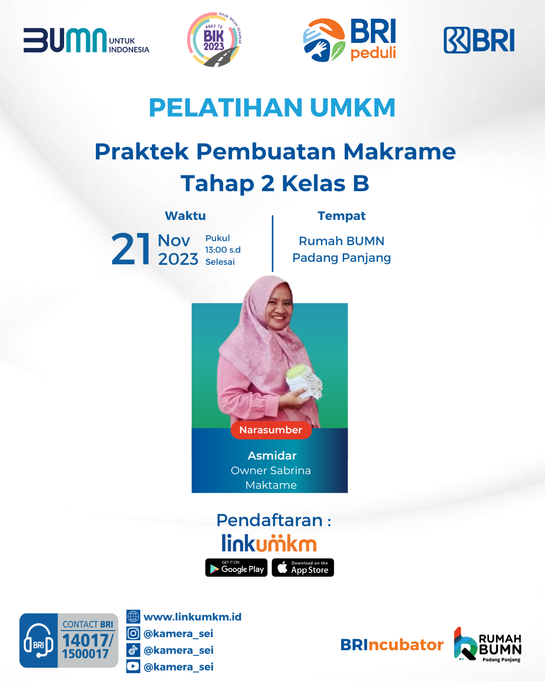 Rumah BUMN Padang Panjang mengadakan Pelatihan Praktek Pembuatan Makrame Tahap 2 Kelas B. Menghadirkan pakar dibidangnya demi kemajuan UMKM Indonesia.