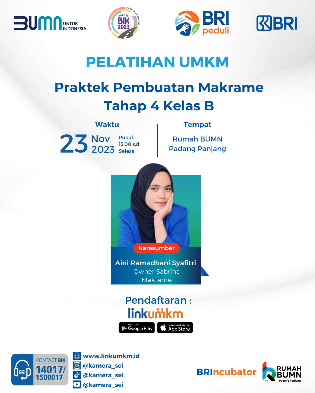 Rumah BUMN Padang Panjang mengadakan Pelatihan Praktek Pembuatan Makrame Tahap 4 Kelas B. Menghadirkan pakar dibidangnya demi kemajuan UMKM Indonesia.