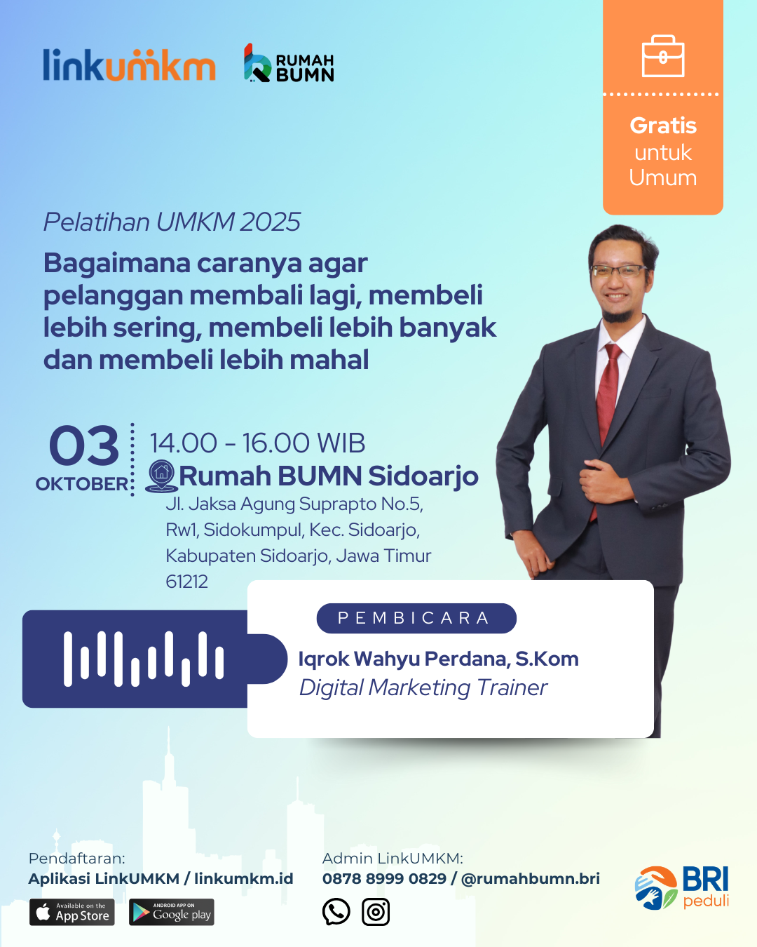 Pelatihan UMKM Literasi Bisnis Bagaimana caranya agar pelanggan membali lagi membeli lebih sering membeli lebih banyak dan membeli lebih mahal