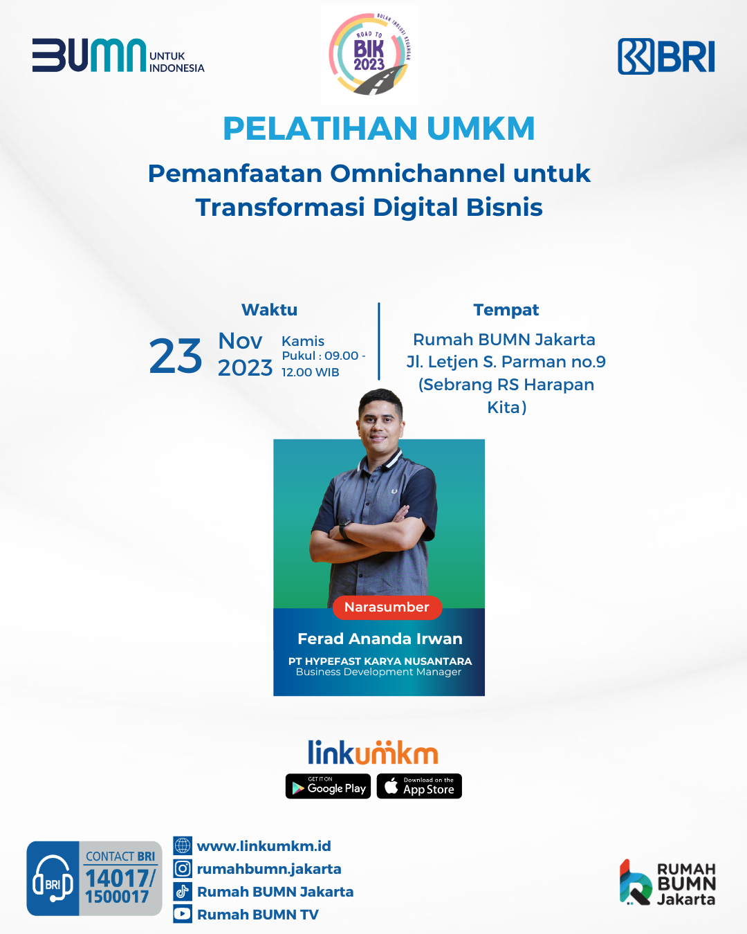 Segera daftarkan UMKM kalian ke pelatihan Pemanfaatan Omnichannel untuk Transformasi Bisnis Digital yang diselenggarakan oleh Rumah BUMN Jakarta, kami tunggu kehadirannya