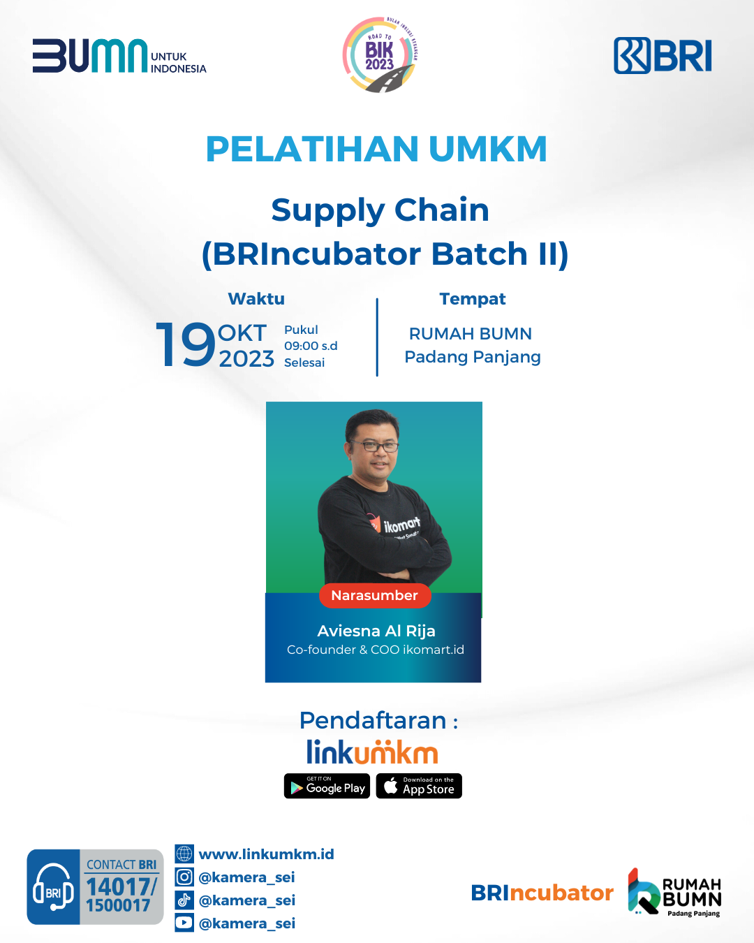 Rumah BUMN Padang Panjang mengadakan Pelatihan Supply Chain BRIncubator Batch II Kelas A. Menghadirkan pakar dibidangnya demi kemajuan UMKM Indonesia.