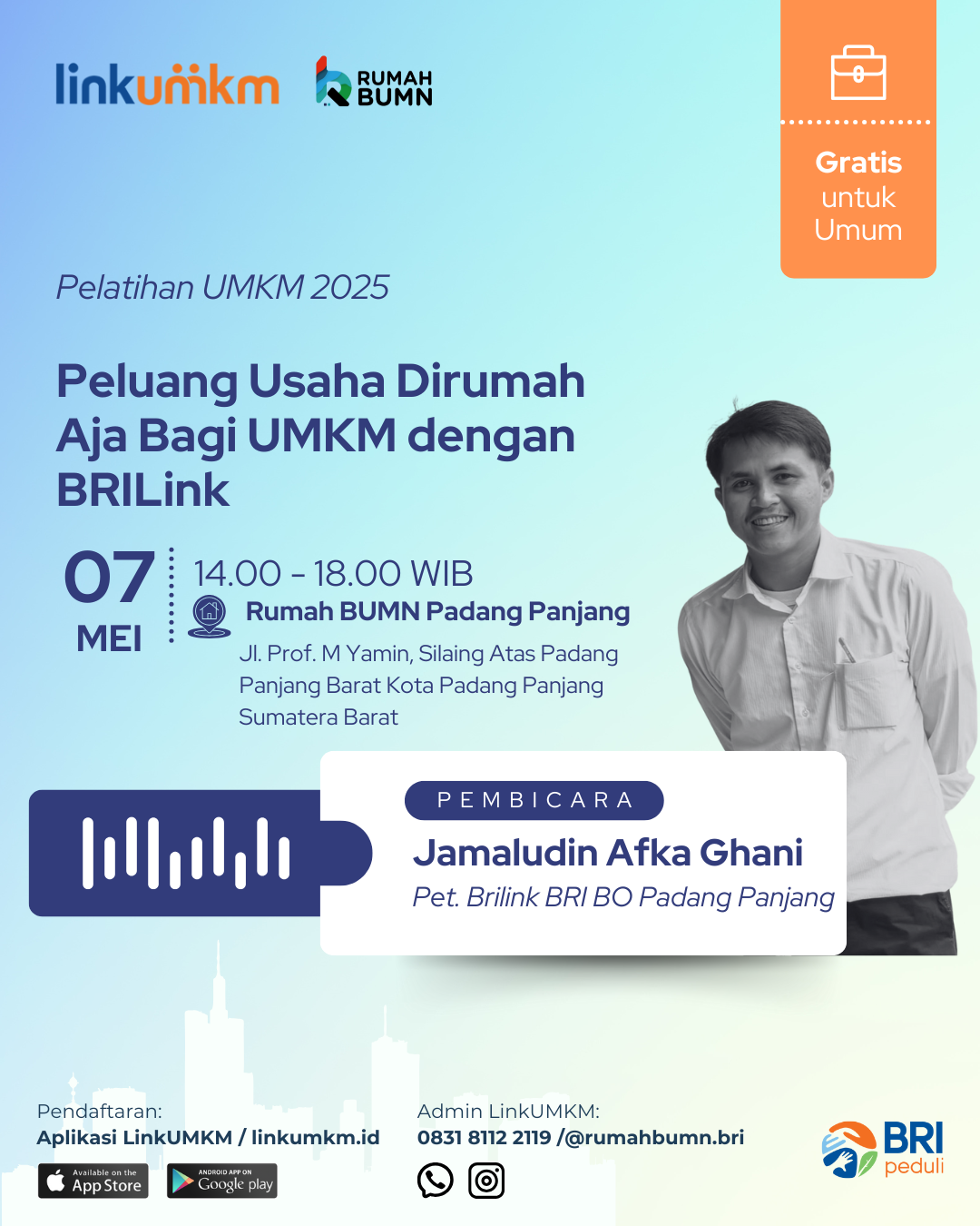 Rumah BUMN Padang Panjang mengadakan Pelatihan Peluang Usaha Dirumah Aja Bagi UMKM dengan BRILink. Menghadirkan pakar dibidangnya demi kemajuan UMKM Indonesia.