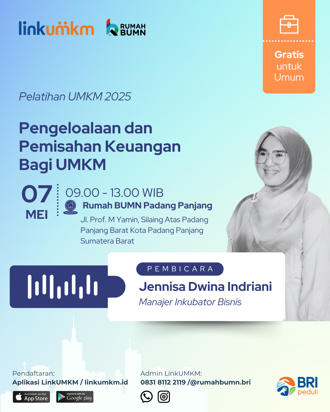 Rumah BUMN Padang Panjang mengadakan Pelatihan Pengelolaan dan pemisahan keuangan bagi UMKM. Menghadirkan pakar dibidangnya demi kemajuan UMKM Indonesia.