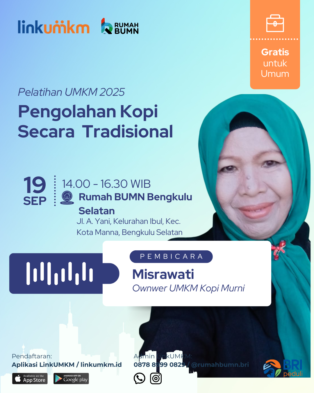 LinkUMKM Pelatihan Dengan Judul Pengolahan Kopi Secara Tradisional Dengan Pembicara Misrawati Selaku Owner UMKM Kopi Murni, Pada Hari Jumat, 19 September 2025 Bertempat Di Rumah BUMN Bengkulu Aelatan.