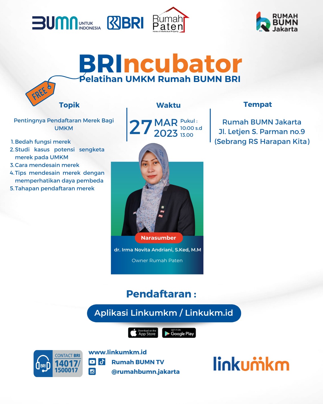 Pada pelatihan kali ini, Rumah BUMN Jakarta berkolaborasi dengan Rumah Paten akan memberikan edukasi seputar pentingnya pendaftaran merek bagi UMKM yang meliputi :