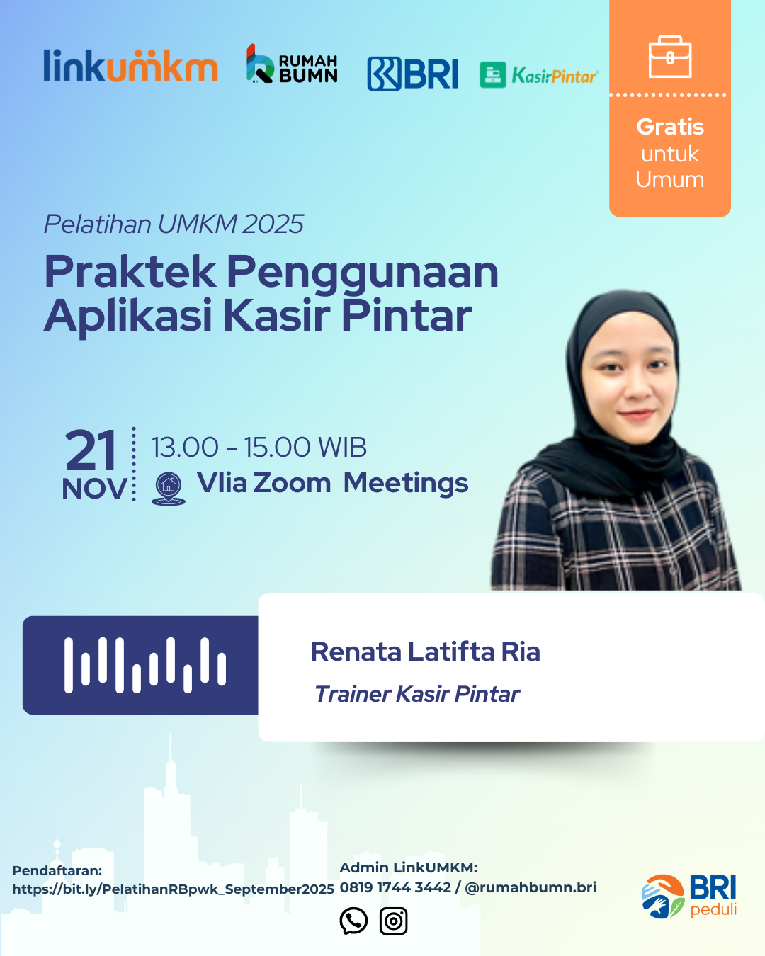 Narasumber : Renata Latifta Ria Judul : Praktek Penggunaan Aplikasi Kasir Pintar Jadwal : 21 November 2025 Waktu : 13.00 - 15.00 tempat : via zoom meetings