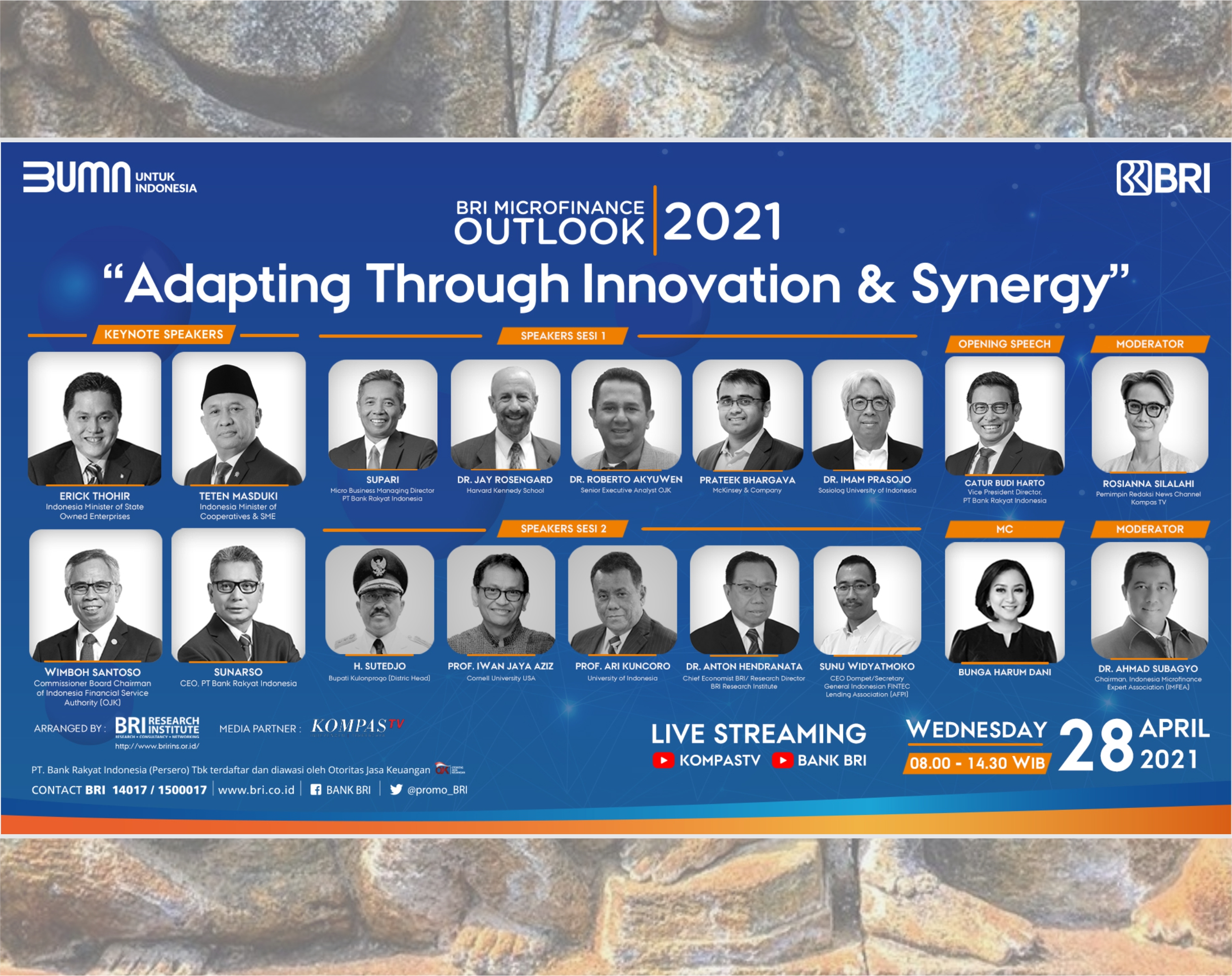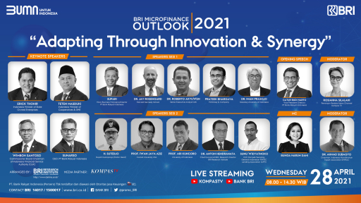 BRI melalui BRI Research Institute menghadirkan Microfinance Outlook 2021: “Adapting Through Innovation and Synergy”. Seminar hybrid ini menghadirkan para pakar di bidangnya dari dalam dan luar negeri, untuk memberikan overview proyeksi dan inovasi 2021 terhadap perkembangan Microfinance, UMKM, Micro Insurance, dan Fintech di era digitalisasi.