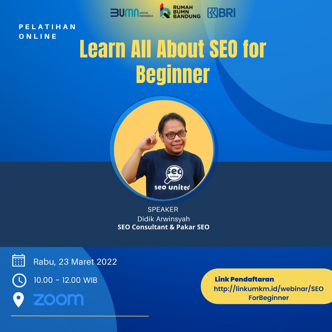Ingin belajar SEO tapi terhalang biaya pelatihan yang mahal? Jangan khawatir! Yuk, ikuti pelatihan online bersama Rumah BUMN Bandung dengan tema “Learn All About SEO for Beginner” yang akan disampaikan oleh Kang Didik Arwinsyah selaku SEO Consultant & Pakar SEO.