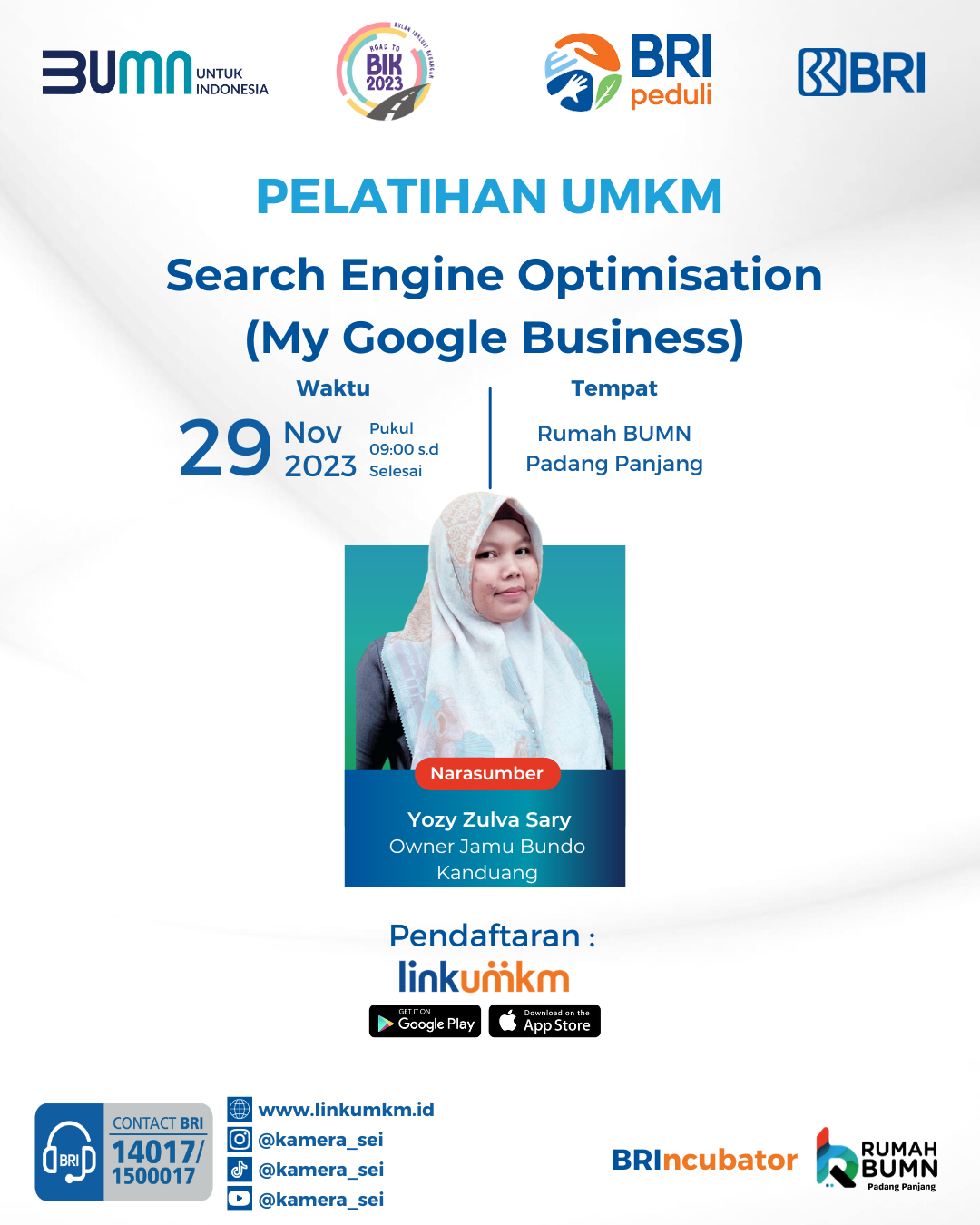Rumah BUMN Padang Panjang mengadakan Pelatihan Search Engine Optimisation My Google Business. Menghadirkan pakar dibidangnya demi kemajuan UMKM Indonesia.