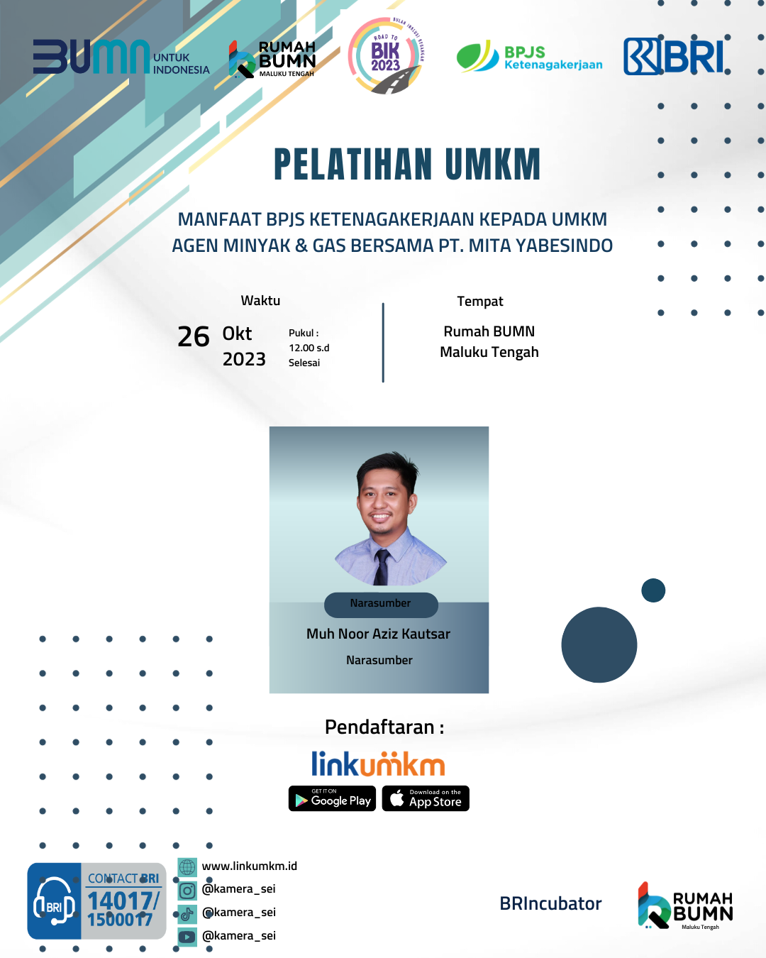 Rumah BUMN Maluku Tengah bekerjasam dengan BPJS Ketenagakerjaan Cabang Masohi melakukan pelatihan sosialsasi tentang manfaat BPJS Ketenagakerjaan kepada UMKM agen minyak dan gas, besar harapanya untuk para UMKM dapat menyadari bahwa dalam suksesnya suatu usaha atau bisnis juga andil dari para pegawai/ karyawan dari para pelaku UMKM sendiri dalam memberikan profit atw keuntungan bagi perusahaan.