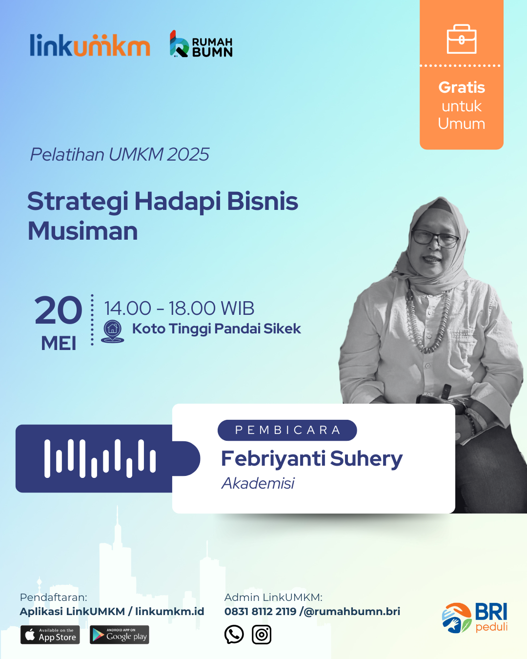 Rumah BUMN Padang Panjang mengadakan Pelatihan Strategi Hadapi Bisnis Musiman. Menghadirkan pakar dibidangnya demi kemajuan UMKM Indonesia.