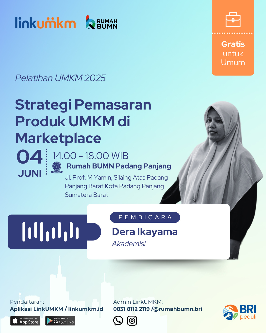 Rumah BUMN Padang Panjang mengadakan Strategi Pemasaran Produk UMKM di Marketplace. Menghadirkan pakar dibidangnya demi kemajuan UMKM Indonesia.