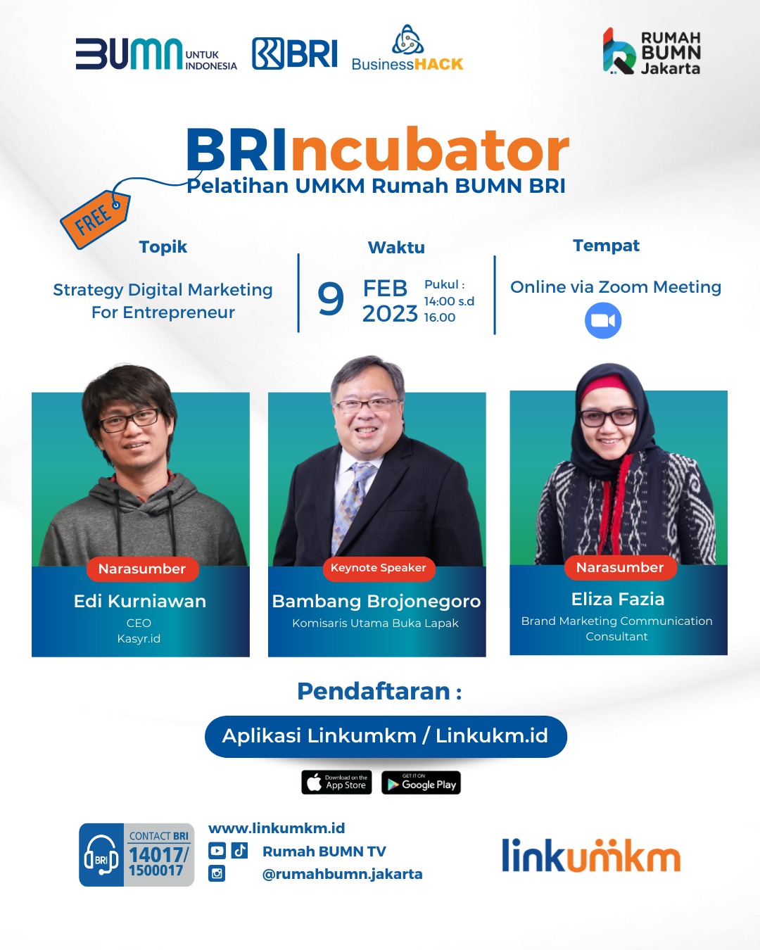 Rumah BUMN Jakarta berkolaborasi dengan UCOACH Indonesia menghadirkan program webinar Business Hack setiap hari kamis pukul 14.00 – 16.00 WIB . Digital Marketing bukan hanya sekedar bisa menggunakan social media, namun terdapat banyak strategi yang harus dipelajari untuk memaksimalkan penjualan anda, salah satunya adalah yang berhubungan dengan IT dan Branding.