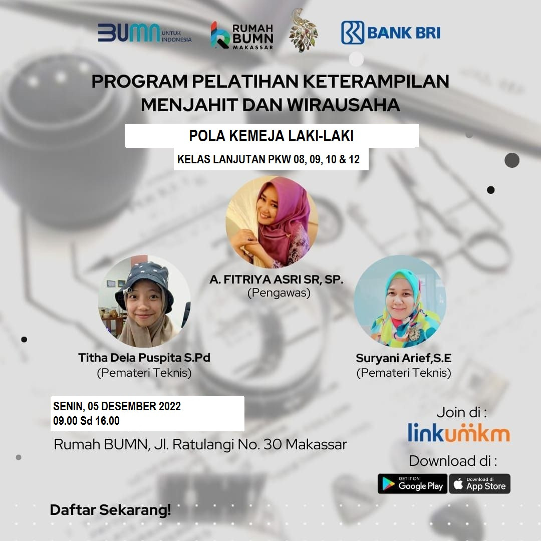 Rumah BUMN Makassar Berkolaborasi dengan Komunitas Dress Maker dan mikromentor chapter makassar akan melangsungkan kegiatan Pelatihan dengan tema "POLA KEMEJA LAKI-LAKI kelas teknis lanjutan PKW 08 09 10 11" Diharapkan output pelatihan ini akan meningkatkan skill/keterampilan agar dapat membantu meningkatkan kesejahteraan rumah tangga.