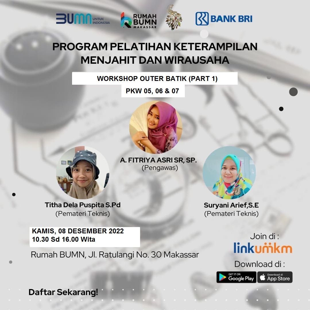 Rumah BUMN Makassar Berkolaborasi dengan Komunitas Dress Maker dan mikromentor chapter makassar akan melangsungkan kegiatan Pelatihan dengan tema "WORKSHOP OUTER BATIK PART 1 kelas teknis lanjutan PKW 5 6 dan 7" Diharapkan output pelatihan ini akan meningkatkan skill/keterampilan agar dapat membantu meningkatkan kesejahteraan rumah tangga.