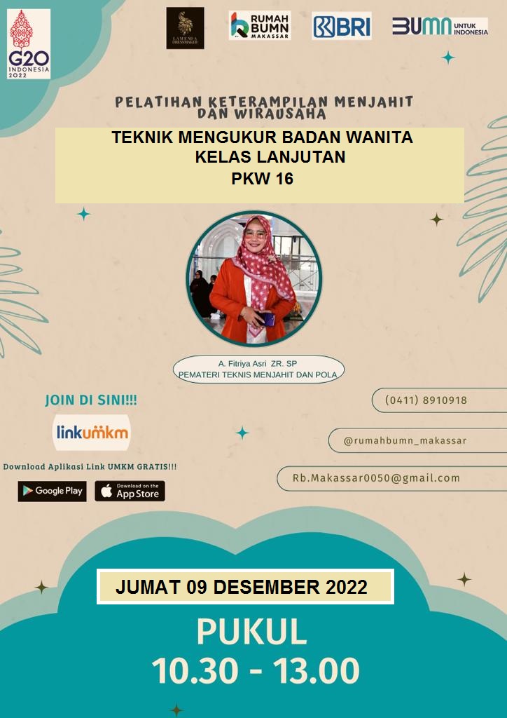 Rumah BUMN Makassar Berkolaborasi dengan Komunitas Dress Maker dan mikromentor chapter makassar akan melangsungkan kegiatan Pelatihan dengan tema "TEKNIS MENGUKUR BADAN WANITA kelas teknis PKW 16" Diharapkan output pelatihan ini akan meningkatkan skill/keterampilan agar dapat membantu meningkatkan kesejahteraan rumah tangga.