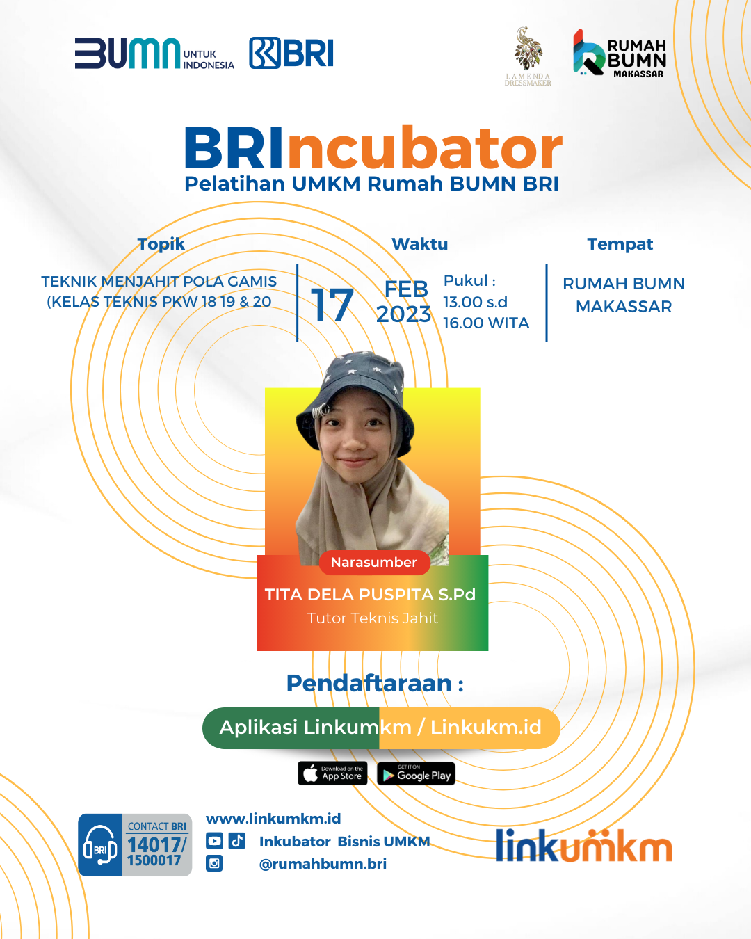 Rumah BUMN Makassar Berkolaborasi dengan Pecinta kopi makassar yang akan akan melangsungkan kegiatan Pelatihan dengan tema "PELATIHAN MENJAHIT POLA GAMIS PKW 18 19 20" Diharapkan output pelatihan ini akan meningkatkan skill/keterampilan agar dapat membantu meningkatkan kesejahteraan rumah tangga.