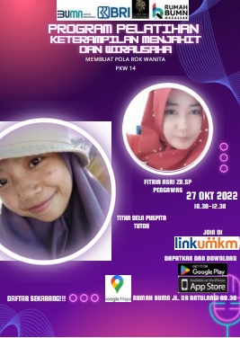 Rumah BUMN Makassar Berkolaborasi dengan Komunitas Dress Maker dan mikromentor chapter makassar akan melangsungkan kegiatan Pelatihan menjahit dengan tema "MEMBUAT POLA ROK (KELAS TEKNIS PKW 14)". Diharapkan output pelatihan ini akan meningkatkan skill/keterampilan agar dapat membantu meningkatkan kesejahteraan rumah tangga.