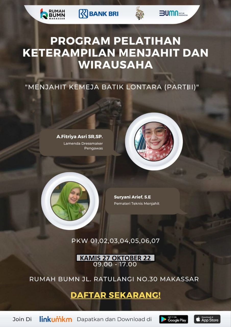 Rumah BUMN Makassar Berkolaborasi dengan Komunitas Dress Maker dan mikromentor chapter makassar akan melangsungkan kegiatan Pelatihan dengan tema "MENJAHIT KEMEJA BATIK LONTARA PART 3 (KELAS TEKNIS GABUNGAN PKW 1, 2, 3, 4, 5, 6 DAN 7". Diharapkan output pelatihan ini akan meningkatkan skill/keterampilan agar dapat membantu meningkatkan kesejahteraan rumah tangga.