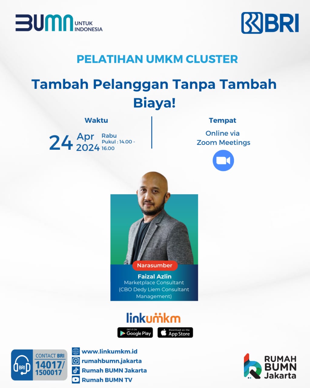 Pelatihan ini merupakan Cluster yang diadakan pada hari Rabu, tanggal 24 April 2024 oleh pak Faizal Azlin, seorang Marketplace Expert. Cluster ini diadakan pada pukul 14.00 - 16.00 via Online Zoom Meeting. Cluster ini berjudul Tambah Pelanggan tanpa Tambah Biaya.