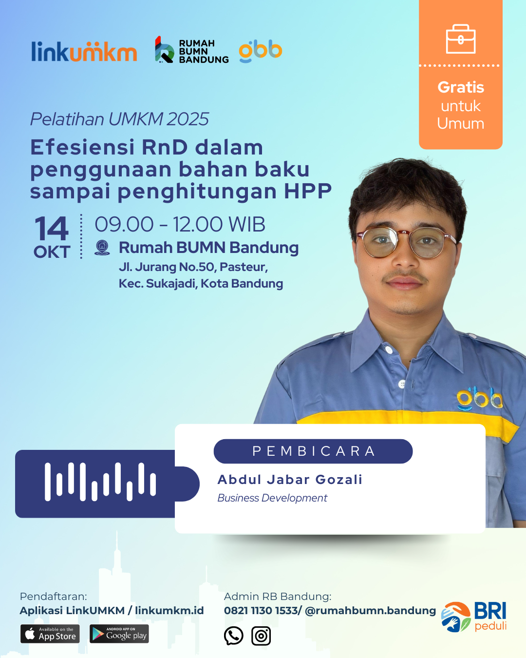 Tempat : Rumah BUMN Bandung Jl. Jurang No. 50, Pasteur, Kec. Sukajadi, Kota Bandung, Jawa Barat 40161