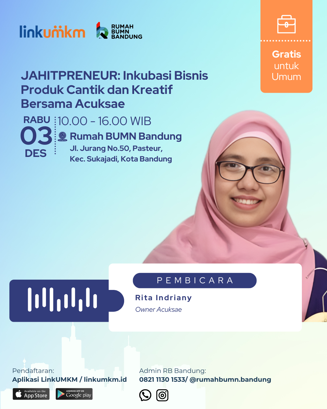 Tempat : Rumah BUMN Bandung Jl. Jurang No. 50, Pasteur, Kec. Sukajadi, Kota Bandung, Jawa Barat 40161.