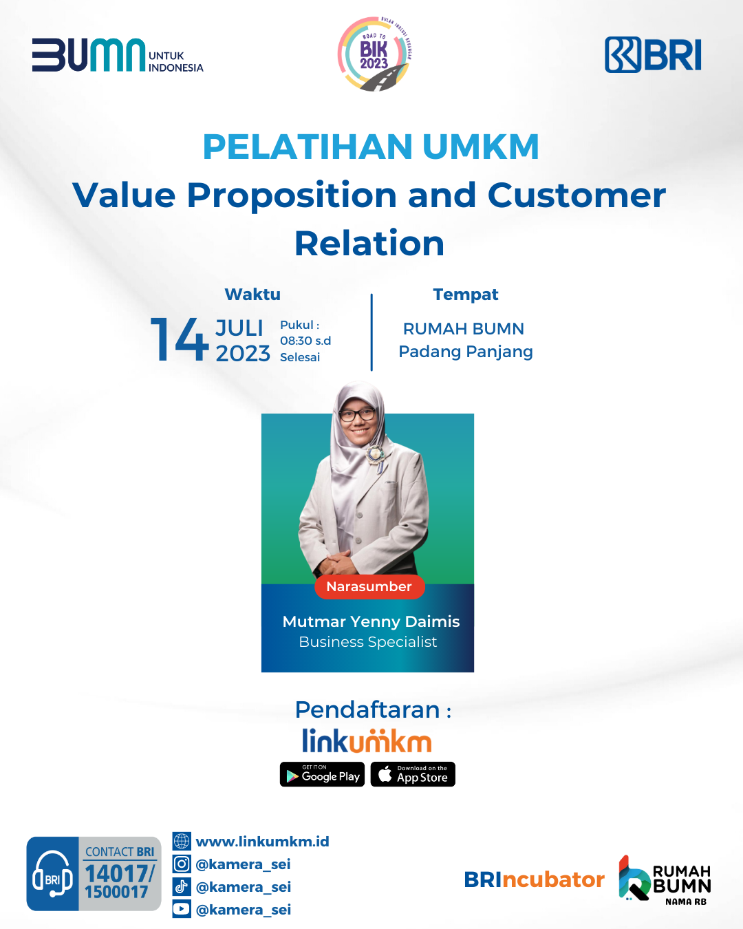 Rumah BUMN Padang Panjang mengadakan Pelatihan Value Proposition and Customer Relation. Menghadirkan pakar dibidangnya demi kemajuan UMKM Indonesia.