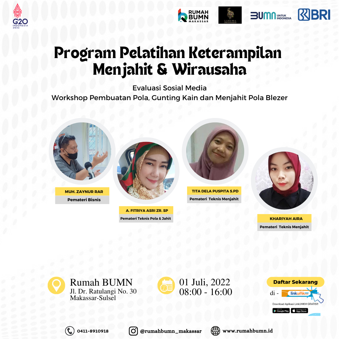 Rumah BUMN Makassar Berkolaborasi dengan Komunitas Dress Maker dan mikromentor chapter makassar akan melangsungkan kegiatan Workshop “Workshop Pembuatan Pola, Gunting Kain dan Menjahit Pola Blezer”. Diharapkan output pelatihan ini akan meningkatkan skill/keterampilan agar dapat membantu meningkatkan kesejahteraan rumah tangga.