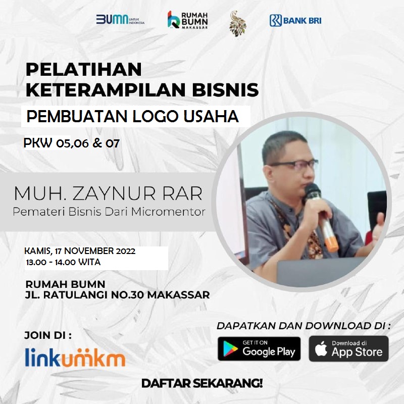 Rumah BUMN Makassar Berkolaborasi dengan Komunitas Dress Maker dan mikromentor chapter makassar akan melangsungkan kegiatan Pelatihan dengan tema "pembuatan logo usaha kelas bisnis lanjutan pkw 5 6 dan 7" Diharapkan output pelatihan ini akan meningkatkan skill/keterampilan agar dapat membantu meningkatkan kesejahteraan rumah tangga.