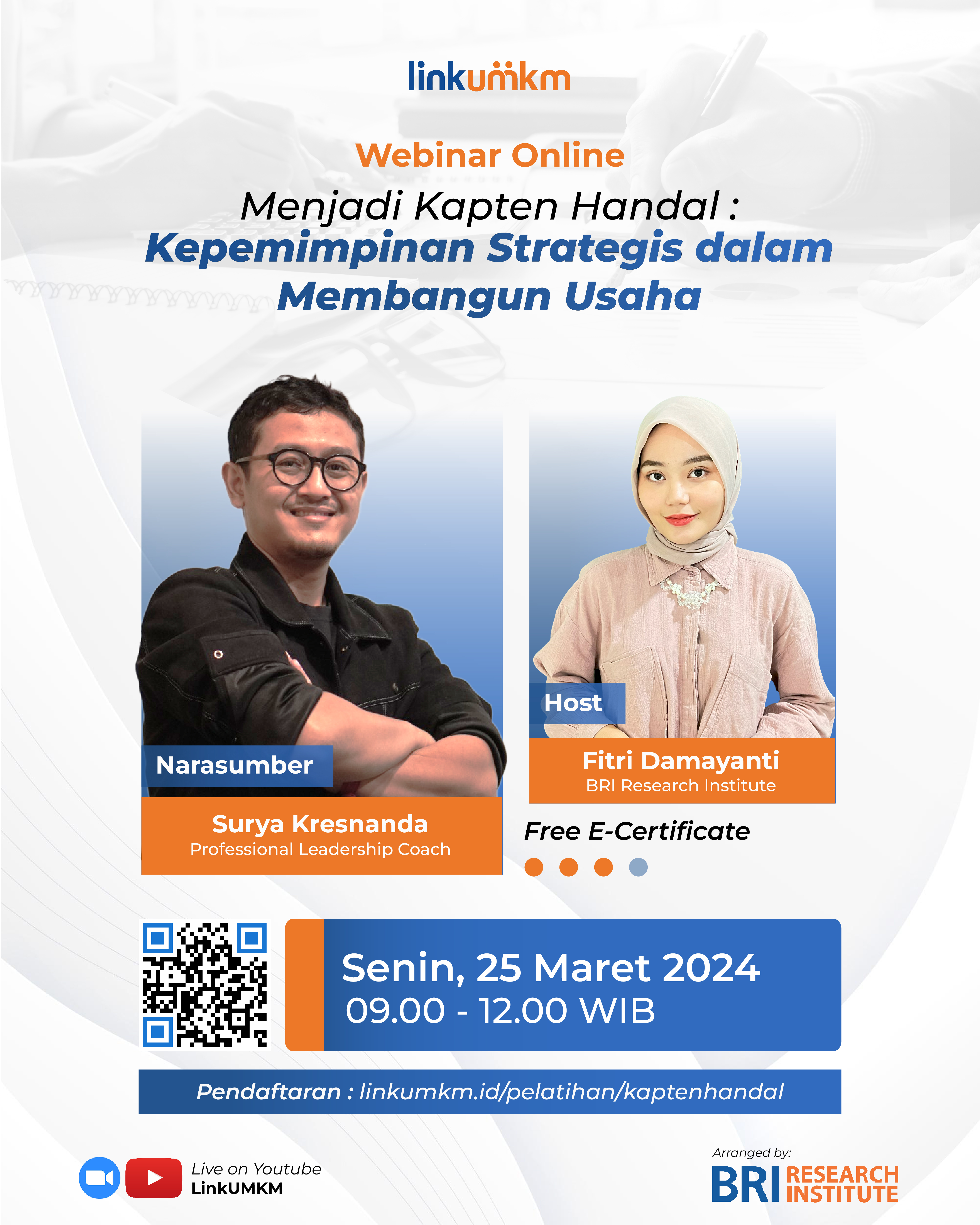 Yuk, kita kupas tuntas strateginya di webinar “Menjadi Kapten Handal: Kepemimpinan Strategis dalam Membangun Usaha” yang seru dan bermanfaat bersama Surya Kresnanda (Profesional Leadership Coach)