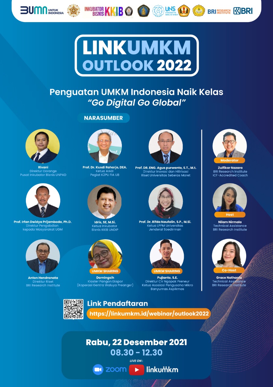 BRI Research Institute menghadirkan LinkUMKM Outlook 2022: "Penguatan UMKM Indonesia Naik Kelas, Go Digital Go Global". Menghadirkan para pakar di bidangnya untuk memberikan overview proyeksi dan inovasi di tahun 2022 mendatang demi kemajuan UMKM Indonesia.