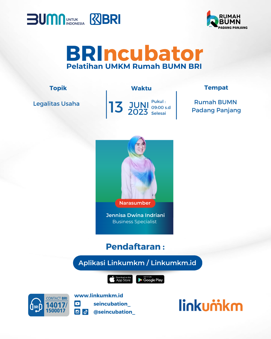 Rumah BUMN Padang Panjang mengadakan Pelatihan Legalitas Usaha BRIncubator. Menghadirkan pakar dibidangnya demi kemajuan UMKM Indonesia.