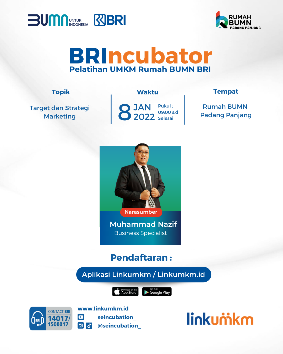 Rumah BUMN Padang Panjang mengadakan Pelatihan Target dan Marketing BRIncubator. Menghadirkan pakar dibidangnya demi kemajuan UMKM Indonesia.