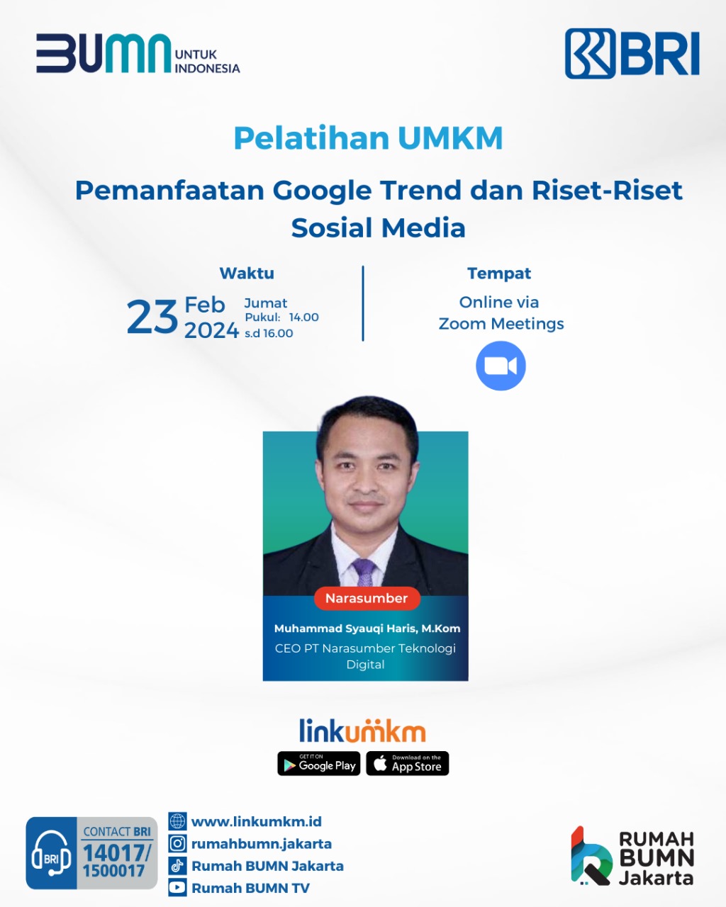 Pelatihan UMKM : Pemanfaatan Google Trend dan Riset Riset Sosial Media yang dilaksanakan tanggal 23 Februari 2024 secara online via Zoom Meeting dan materi akan disampaikan oleh Muhammad Syauqi Haris, M.Kom